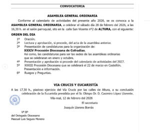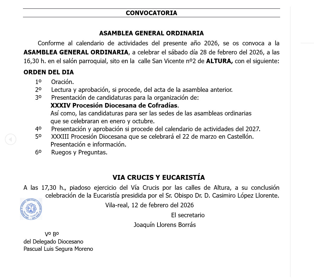 « Todos los Eventos Este evento ha pasado. ASAMBLEA GENERAL ORDINARIA 28 febrero @ 16:30 - 17:30 UTC+0 « XXXVI PREGÓN DIOCESANO SEGORBE 2026 IV VÍA CRUCIS DIOCESANO » Añadir al calendario Google Calendar iCalendar Outlook 365 Outlook Live Detalles Fecha: 28 febrero Hora: 16:30 - 17:30 UTC+0 Web: https://cofradiassegorbecastellon.com/wp-content/uploads/2026/02/Convocatoria.jpeg Local ALTURA C/ San Vicente, 2 Altura, Castellón Spain + Google Map
