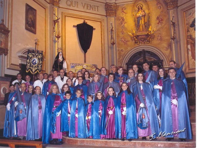 Vesta: La Vesta esta compuesta por una túnica de color púrpura, capuchón y manto azul, cinturón con el emblema de la Hermandad y guantes blancos. Con el fin de complementarla, también forma parte de la vestimenta del cofrade de esta Hermandad, una espada, como símbolo de la escolta y guardia noble que los primeros fundadores de la misma deseaban dar a la Santísima Virgen de los Dolores.
