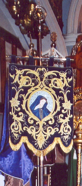 Símbolos o Estandartes: El símbolo de la Hermandad es un corazón atravesado por siete espadas, que se lleva bordado bajo el antifaz del capirote. También se lleva el mismo emblema trabajado en metal con un cinturón para ceñir la túnica. El estandarte ó guión fue confeccionado en 1964 y en él va bordada la imagen de la Santísima Virgen de los Dolores en la parte delantera.