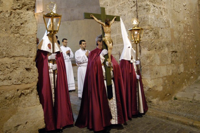Entre las procesiones la del Santo Entierro por el sentimiento, reflejado más si cabe en los portadores del Cristo Yaciente pertenecientes a las tres Cofradías de la Ciudad.